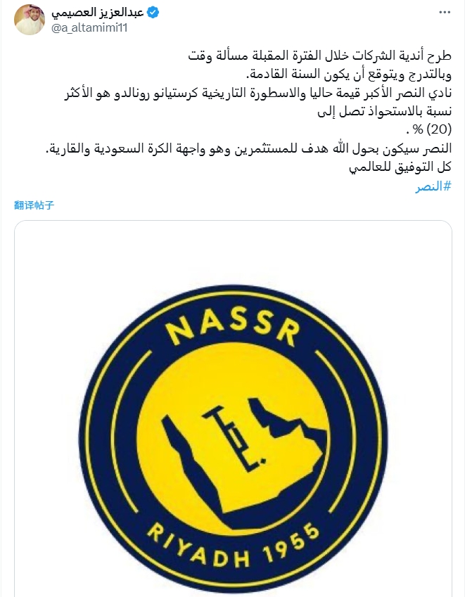• 沙特记者:罗纳尔多目前拥有利雅得胜利的权益比例最高 达到20